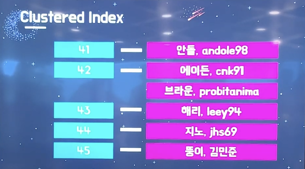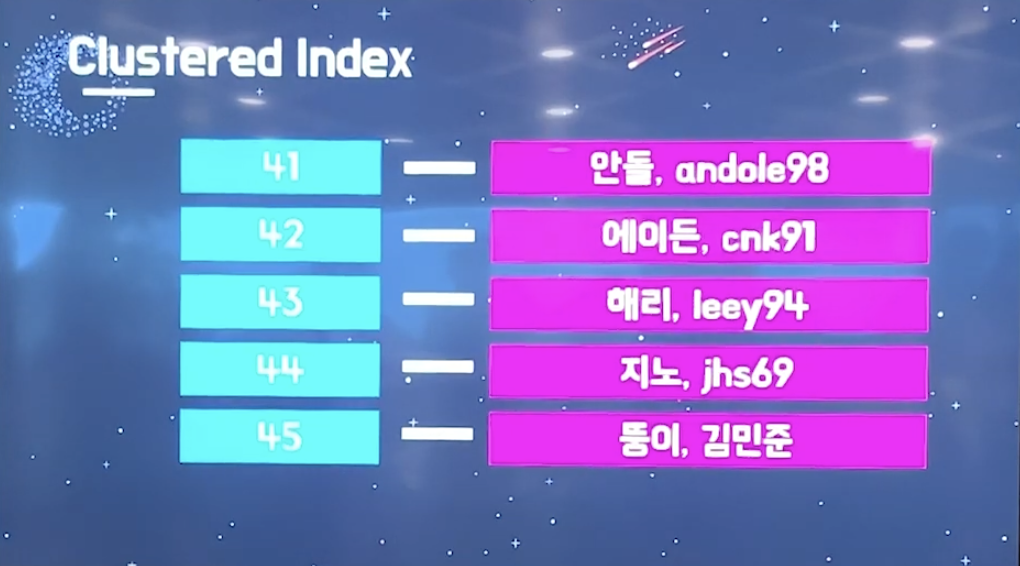 이와같이 Clustered Index는 index와 data의 군집으로 이루어져있다.