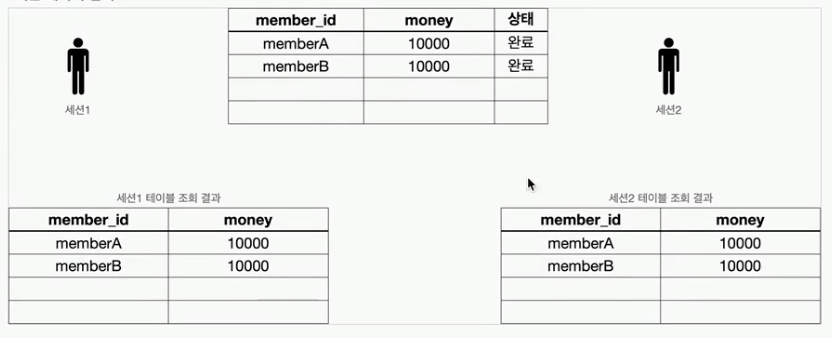 세션1은 A가 8000원인 상태로 조회되고, 세션B에서는 그대로 A,B둘다 10000원으로 조회된다.