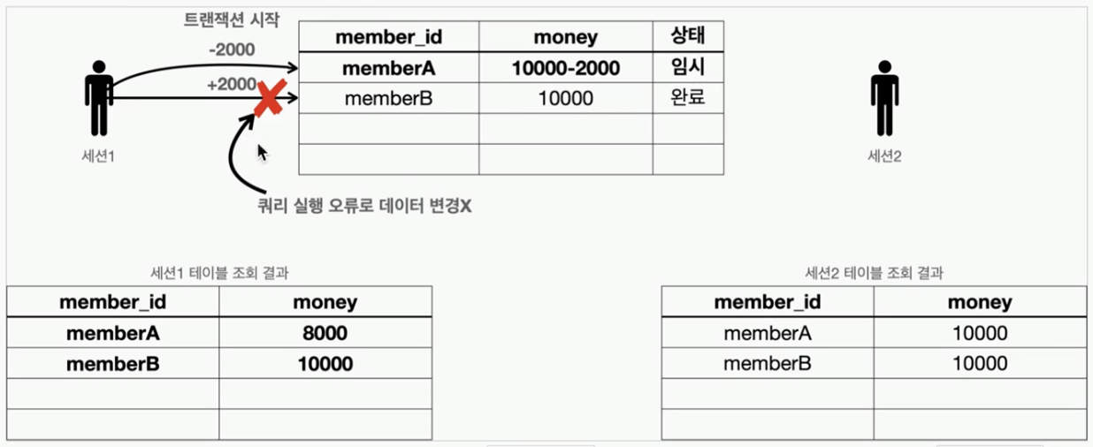 SQL에 오류가 있어 memberA의 돈은 2000원 줄어들었지만