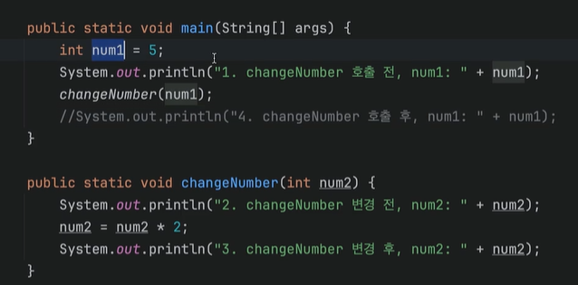 3. changeNumber 변경 후, num2는 위에 코드 num2 = num2 * 2에서 파라미터 num2가 5로 받아서 왔기때문에 num2 =5*2가 되고 따라서 num2 = 10이 들어가서 10이 출력된다.